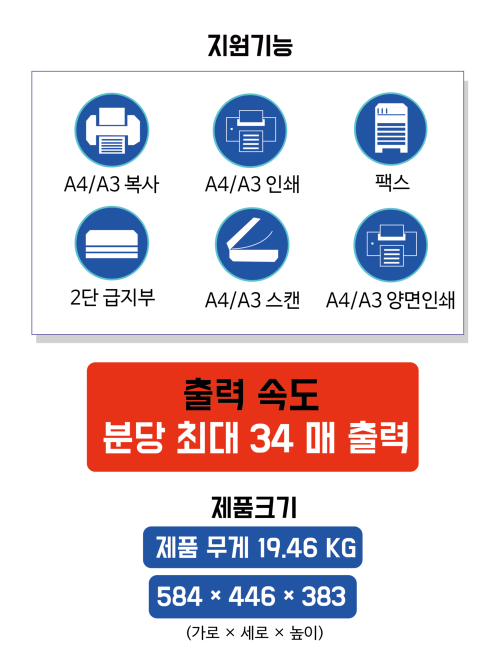 복합기 최대 A3 용지 출력이 가능한 복합기입니다.